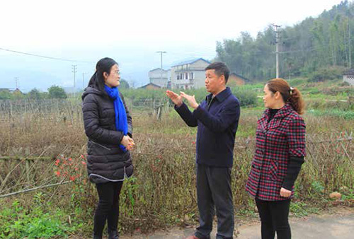 林善平代表(中)走訪(fǎng)回鄉(xiāng)的大學(xué)畢業(yè)生施穎( 左一),鼓勵(lì)她扎根山區(qū),為山區(qū)發(fā)展貢獻(xiàn)聰明才智。攝影/ 王爭(zhēng)
