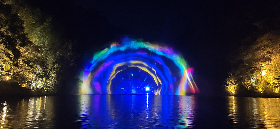 入夜,黨支部一行來到本次文旅最精彩的項目:“夜游九龍?zhí)?rdquo;。以“夜游九龍?zhí)叮o享夜的美”為主題的“行進式”水上峽谷夜游景區(qū),利用現(xiàn)代化聲光技術與景區(qū)自然美景有機融合,讓您充分感受“詩意山水,光影幻境”。聽蛙唱蟲奏,觀月下仙境,月光映水,水波映月,加上臨水棧道邊笛聲陣陣......讓您真切的領會空靈、幽靜、夢幻的別樣意境。一路的聲光風景讓人目不暇接,如果不是身臨其境,絕對感受不到那光影與大自然結合產(chǎn)生的絕妙意境。