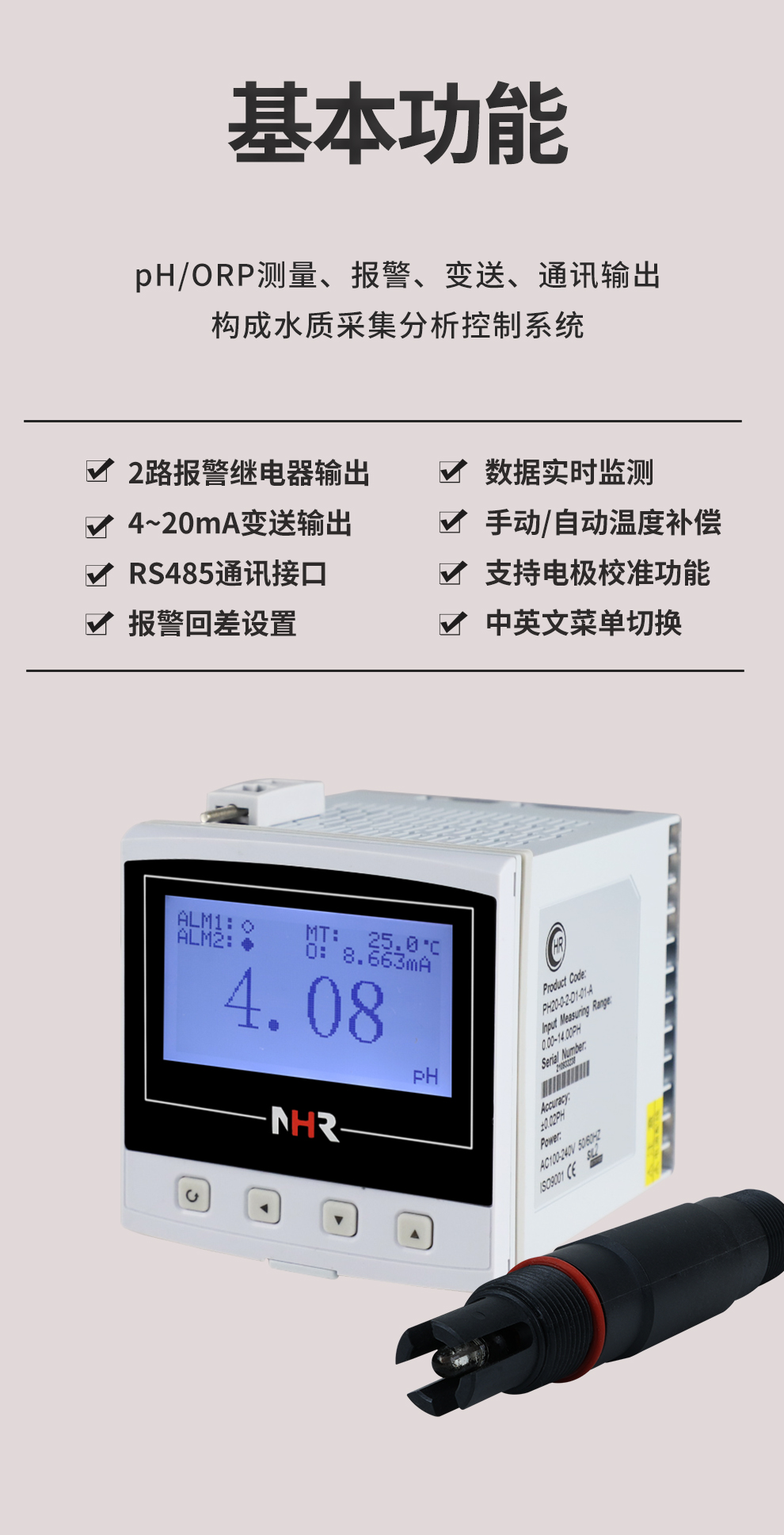 虹潤(rùn)公司是專(zhuān)業(yè)生產(chǎn)水質(zhì)分析儀的國(guó)家專(zhuān)精特新“小巨人”企業(yè)。生產(chǎn)的經(jīng)濟(jì)型pH/ORP控制器,具有采用高阻設(shè)計(jì),測(cè)量穩(wěn)定不跳字,中英文菜單切換,變送輸出精準(zhǔn),標(biāo)配報(bào)警、變送、RS485通訊等特點(diǎn)。產(chǎn)品獲得一種適應(yīng)性強(qiáng)PH控制儀、智能化控制器等2項(xiàng)國(guó)家發(fā)明專(zhuān)利;主持起草現(xiàn)場(chǎng)設(shè)備集成等5項(xiàng)智能制造國(guó)家標(biāo)準(zhǔn),以及現(xiàn)場(chǎng)設(shè)備工具(FDT)接口規(guī)范、工業(yè)過(guò)程控制系統(tǒng)用模擬輸入兩位或多位輸出儀表、過(guò)程分析技術(shù)系統(tǒng)等3項(xiàng)國(guó)家標(biāo)準(zhǔn);參與國(guó)際5G標(biāo)準(zhǔn)制定,取得PH測(cè)量?jī)x表等3項(xiàng)相關(guān)軟件著作權(quán)。產(chǎn)品廣泛應(yīng)用于實(shí)驗(yàn)室、水處理、環(huán)境監(jiān)測(cè)、食品、制藥、農(nóng)業(yè)等諸多領(lǐng)域。