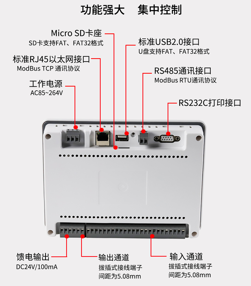 OHR-T系列觸摸超薄無紙記錄儀采用新型大規(guī)模集成電路,對(duì)輸入、輸出、電源、信號(hào)采取可靠保護(hù)和強(qiáng)抗干擾設(shè)計(jì)。8路萬能信號(hào)輸入(可組態(tài)選擇輸入:標(biāo)準(zhǔn)電壓、標(biāo)準(zhǔn)電流、熱電偶、熱電阻、頻率、毫伏等)。可帶4路報(bào)警輸出,1個(gè)饋電輸出,RS485通訊接口,以太網(wǎng)接口,微型打印機(jī)接口和USB接口,SD卡插座。