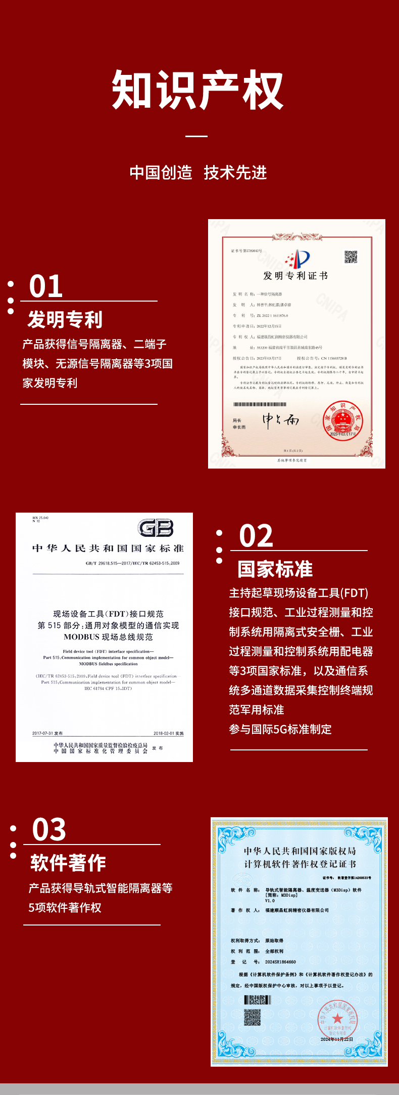 虹潤公司是專業(yè)生產(chǎn)隔離器的國家專精特新“小巨人”企業(yè)。生產(chǎn)的智能信號隔離器涵蓋電流電壓變送器、溫度變送器、配電器、頻率轉(zhuǎn)換器、開關(guān)量轉(zhuǎn)換器及通訊轉(zhuǎn)換器等多種產(chǎn)品類型。產(chǎn)品獲得信號隔離器、一種二端子模塊、無源信號隔離器等3項國家發(fā)明專利,主持起草現(xiàn)場設(shè)備工具(FDT)接口規(guī)范、工業(yè)過程測量和控制系統(tǒng)用隔離式安全柵、工業(yè)過程測量和控制系統(tǒng)用配電器等3項國家標準,以及通信系統(tǒng)多通道數(shù)據(jù)采集控制終端規(guī)范軍用標準,參與國際5G標準制定,取得導軌式智能隔離器、頻率轉(zhuǎn)換器等3項相關(guān)軟件著作權(quán)。產(chǎn)品廣泛電力、冶金、工業(yè)電爐、變電站、高壓電機房等需要電隔離的工業(yè)自動化控制系統(tǒng)。
